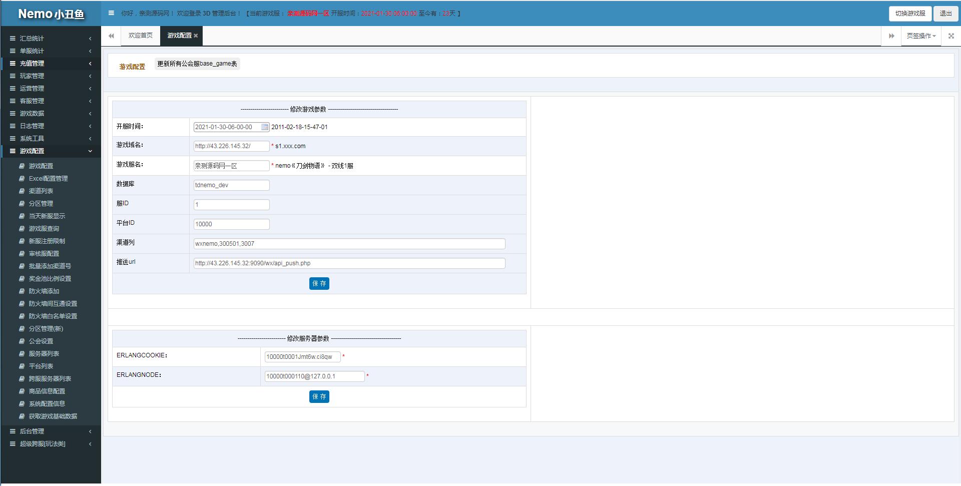 进入后台后选【游戏配置】把里面所有配置的192.168.200.128修改成你自己的IP